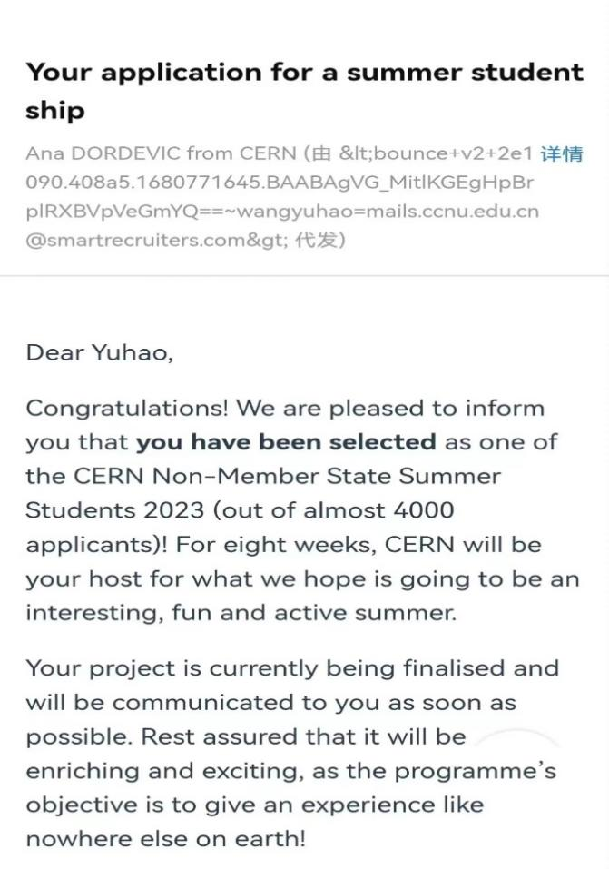 图 1 王禹昊同学入选CERN“summer students”的邮件